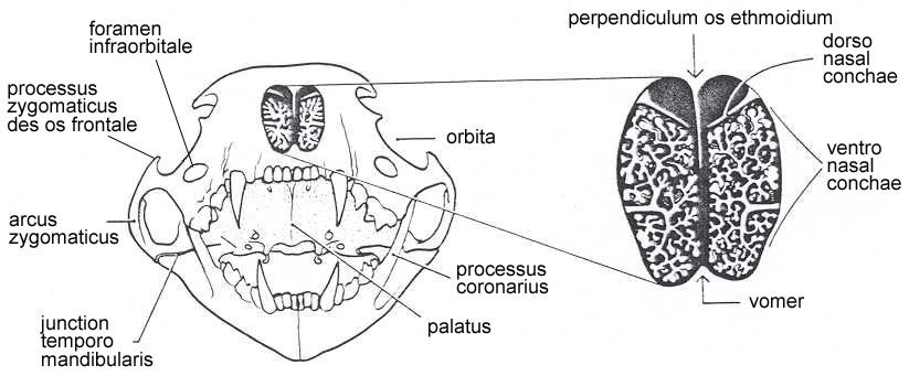 Der knöcherne Schädel ist rundlicher und gedrungener als bei den Mardern, da die Kiefer kürzer ausgebildet sind. Im Vergleich zum Waldwiesel ist auffällig, daß der Hirnschädel hinter den Augenhöhlen stark eingeschnürt ist. Diese interorbitale Schädelverengung kann als Folge der Domestikation angesehen werden, die über Abstammungsverhältnisse nichts aussagt. HERTER (1959) vermutet, daß diese Einschnürung des Hirnschädels sich im Laufe der postembryonalen Entwicklung ausbildet.
