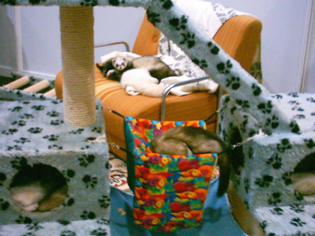 Schon am 2. Tag fühlen sich unsere Frettchen auf dem Messestand wie Zuhause, alle Schlafplätze