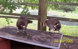 | Seit November 2004 wohnt die "wilde" Franzi in Rendsburg bei 4 anderen Waschbären und ist dort eine der liebsten und zahmsten laut Besitzer. Für Daisy und Betty haben wir ein 40 qm Gehege in Leipzig gefunden was uns zur Verfügung gestellt wurde. Auf dem Stadtgut Mölkau im altem Luchsgehege toben die Beiden nun ausgelassen herum und sind dort ein Publikumsmagnet geworden. Fotos und genauer Bericht folgen später......... |